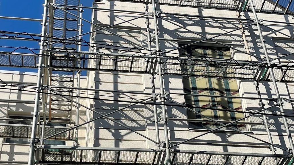 工事を最後まで安全に進める上で、最も大切なのがこの工程です。近隣にお住まいの方への万全の配慮を徹底し、足場を組み立てます。