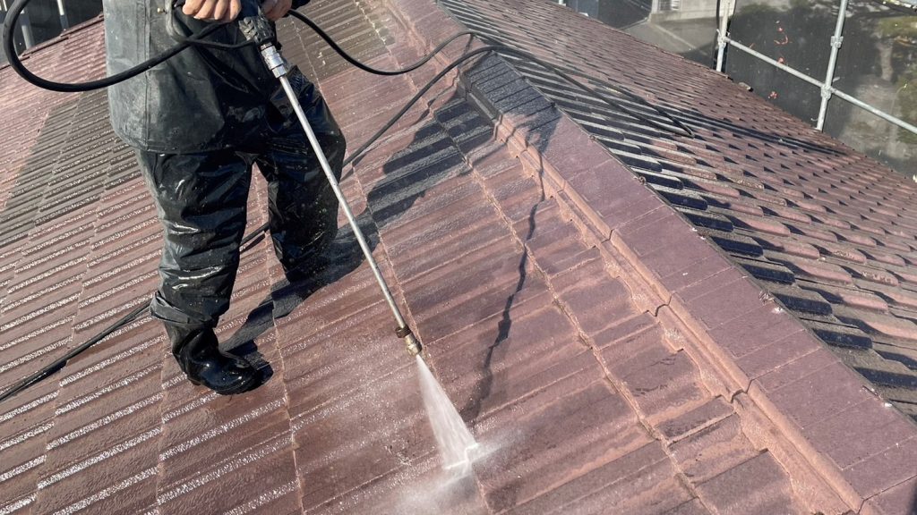 外壁・屋根塗装において、下地に汚れを残すことなく、使用塗料本来の性能を最大限に発揮させ、より壁面に密着させるポイントの一つが、塗装箇所の入念な高圧洗浄です。