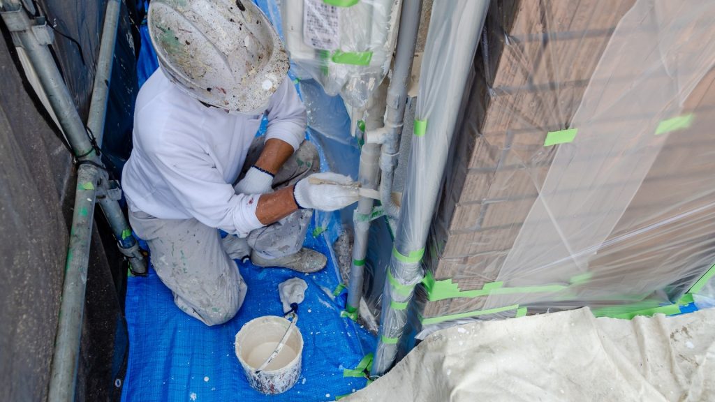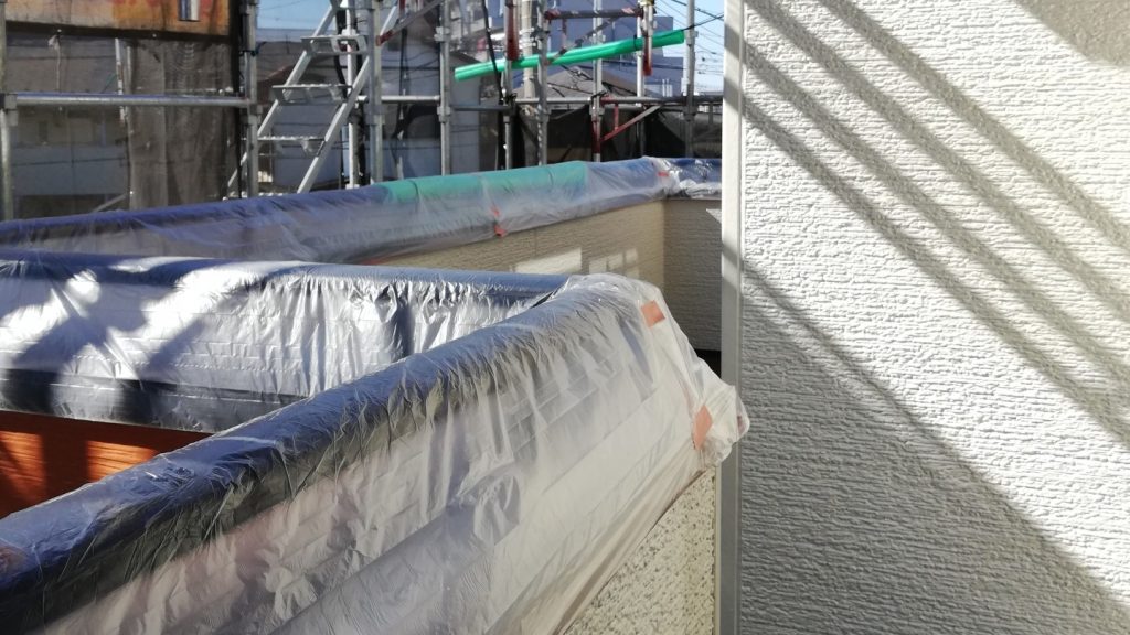 塗料の飛散や付着を防ぐため、ビニールで対象物を覆って保護する作業で、塗料のわずかな付きや跳ねなどから窓やベランダ、手すりなどを守るための繊細な工程をおこないます。